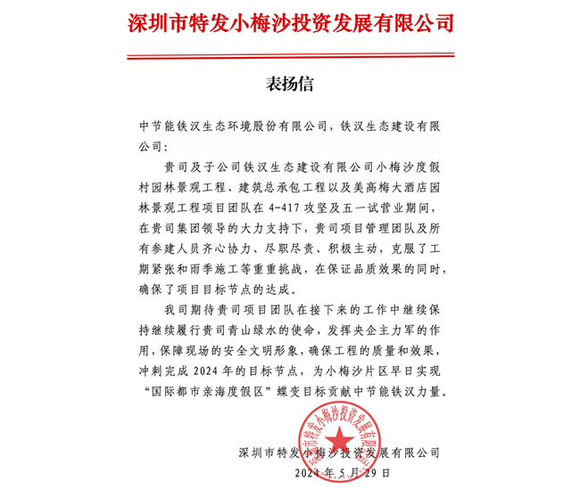 日前,由中節(jié)能鐵漢及所屬子公司承建的深圳小梅沙項(xiàng)目群獲得業(yè)主單位——深圳市特發(fā)小梅沙投資發(fā)展有限公司(以下簡(jiǎn)稱小梅沙投資)發(fā)來(lái)的表?yè)P(yáng)信。