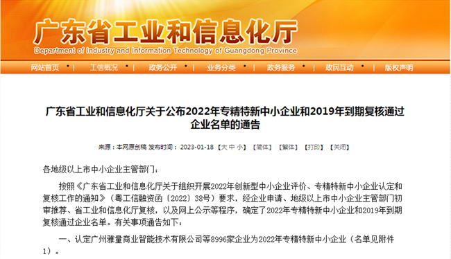 同時,根據(jù)廣東省工業(yè)和信息化廳發(fā)布的《關(guān)于公布2022年專精特新中小企業(yè)和2019年到期復(fù)核通過企業(yè)名單的通知》,鐵漢環(huán)保被認定為廣東省2022年度專精特新中小企業(yè),有效期自公布之日起三年。“專精特新”中小企業(yè)是指實現(xiàn)專業(yè)化、精細化、特色化發(fā)展、創(chuàng)新能力強、質(zhì)量效益好的優(yōu)質(zhì)企業(yè)。本次“專精特新”中小企業(yè)評選是廣東省工信廳基于從事特定細分市場年限、研發(fā)費用總額、研發(fā)強度、營業(yè)收入等基本條件,選拔出創(chuàng)新能力強、市場占有率高、質(zhì)量效益優(yōu)的排頭兵。