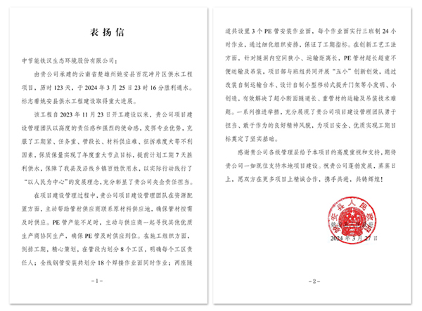 姚安縣人民政府專程發(fā)來(lái)《表?yè)P(yáng)信》,指出,項(xiàng)目自20231123日開工建設(shè)以來(lái),中節(jié)能鐵漢項(xiàng)目建設(shè)管理團(tuán)隊(duì)以高度的責(zé)任感和強(qiáng)烈的使命感,發(fā)揮專業(yè)優(yōu)勢(shì),克服了工期緊、任務(wù)重、管段長(zhǎng)、材料供應(yīng)難、征拆難度大等不利因素,保質(zhì)保量實(shí)現(xiàn)了年度重大節(jié)點(diǎn)目標(biāo)并提前7天供水,保障了姚安縣及沿線鄉(xiāng)鎮(zhèn)百姓飲用水,對(duì)助力當(dāng)?shù)剜l(xiāng)村振興具有重要作用,以實(shí)際行動(dòng)踐行了“以人民為中心”的發(fā)展理念,充分彰顯了央企責(zé)任擔(dān)當(dāng)。