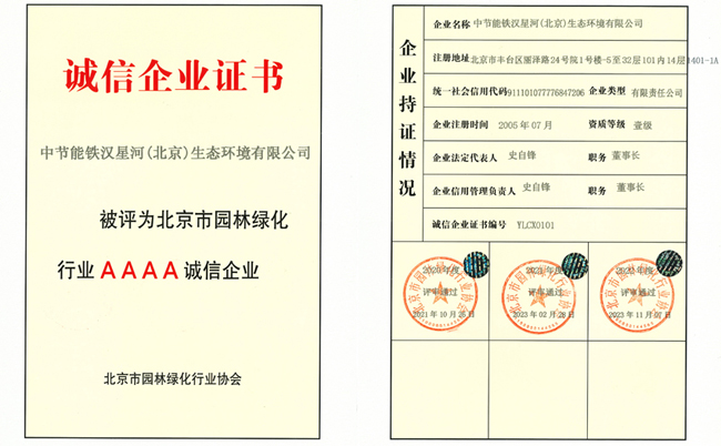 近日,經北京市園林綠化行業協會評定,中節能鐵漢所屬鐵漢星河取得4A等級“誠信企業”認證。自2014年以來,鐵漢星河連續九年獲此殊榮,以實力贏得行業和社會的持續認可。